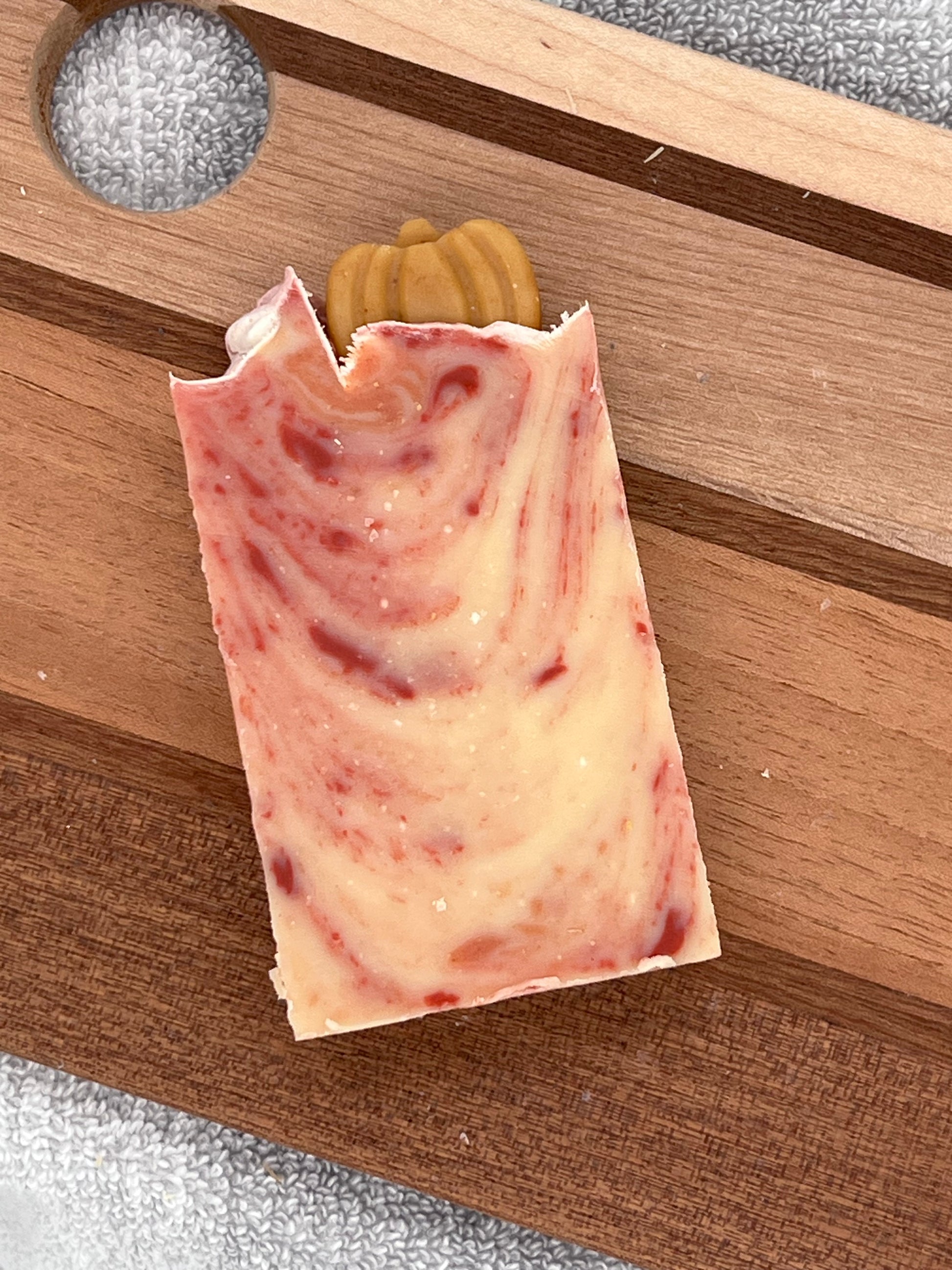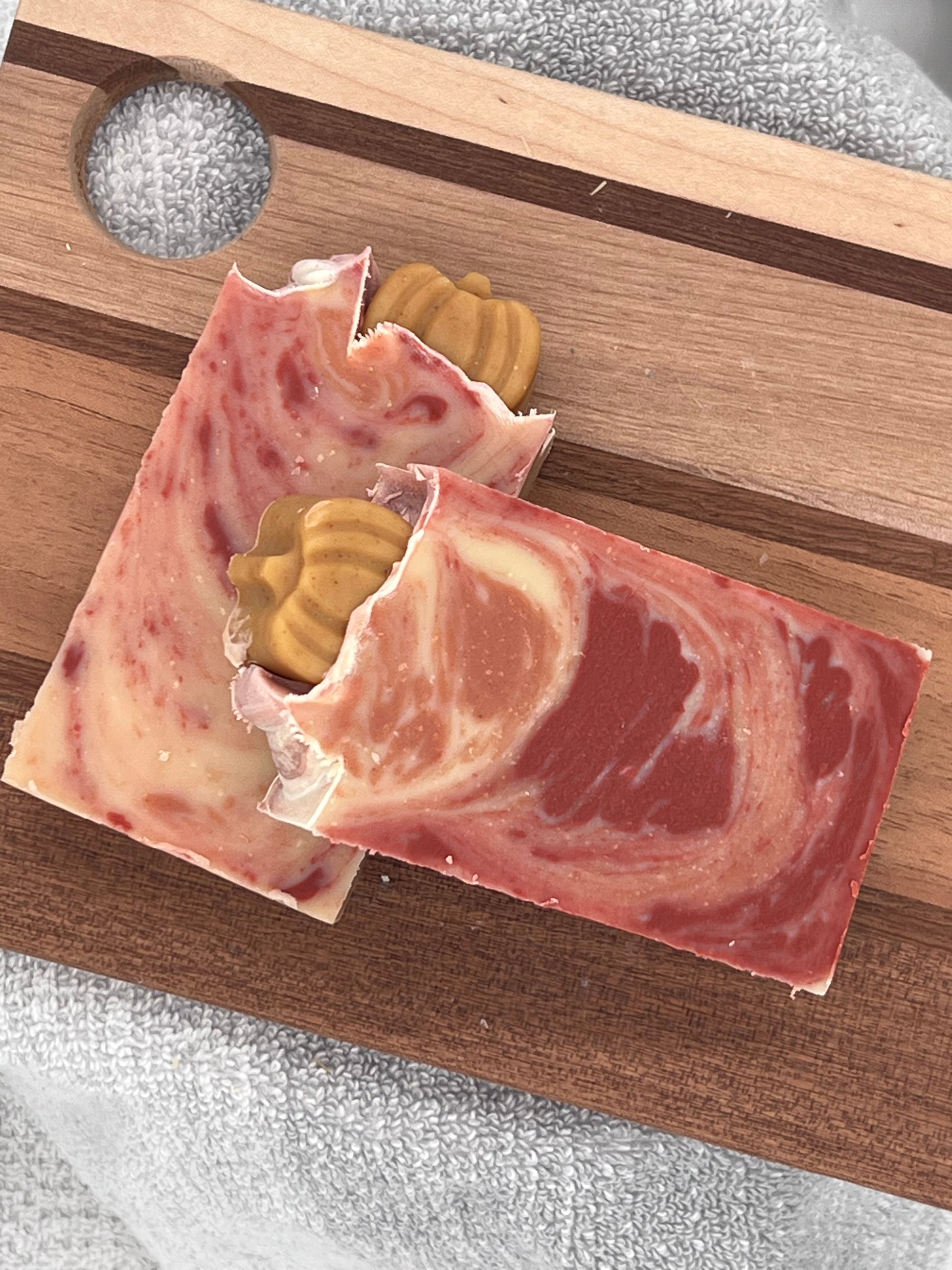 Wrap yourself in the cozy comfort of fall with Rustic Harvest Goat Milk Bath Soap. Made with creamy goat milk, rich butters, and nourishing oils, this bar provides a gentle cleanse that leaves skin soft and refreshed. Swirls of turmeric and red oxide create a warm, rustic design inspired by autumn leaves — and each bar is topped with a mini pumpkin crafted from our Lemon Turmeric Face Soap for the perfect harvest touch.